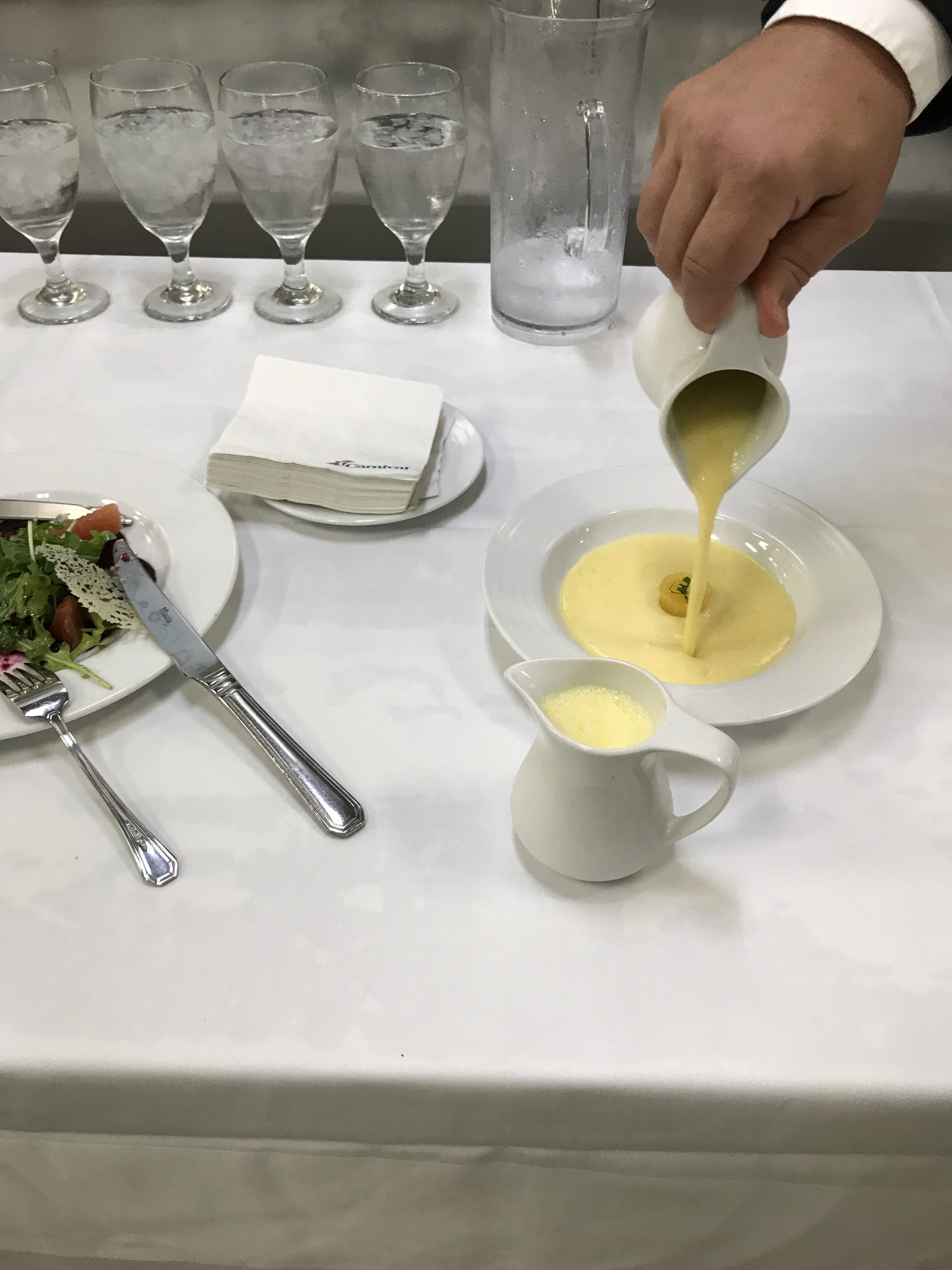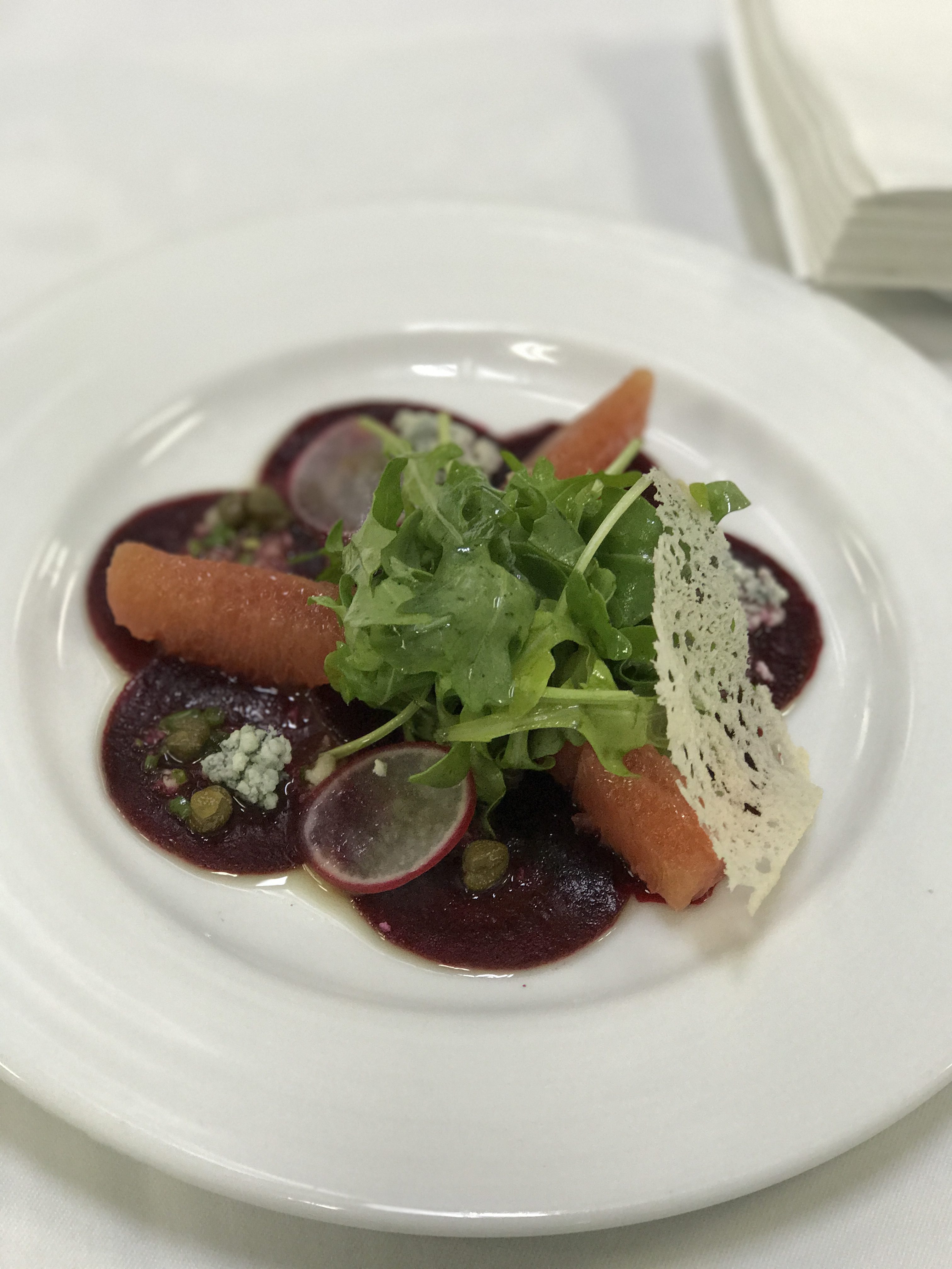 I had the pleasure of getting to know our Maitre d’ on our ship Mr. Csaba Varga Attila and he invited us to have a special tour of the galley (aka kitchen area) during our cruise. Not only did we get a private tour – but they prepared a special tasting of the entire menu for that evening’s dinner, including all options for starters, main courses and desserts. When we first arrived we were greeted by the Chef de Cuisine Mr. Ramesh and Food Manager Mr. Milind along with Mr. Attila. They gave us a little introduction about how many meals they have to prepare each day (2,000 in each of the 2 dining rooms – including breakfast and dinner) and how they go about creating tasteful and innovative menus that will please everyone. There are so many cruisers (3,000+ on many ships) and they have to make meals appealing to everyone from the health fanatic to the foodie. So, they offer a huge variety meal options including vegetarian, vegan, nut-free and gluten free. I am a pretty healthy eater and loved sampling all the creative vegetarian options like the beet carpaccio. But, my Dad (who was also with us) is a big foodie and loves meat – so he really enjoyed sampling the ox tongue and other more decadent items. Every night they have at least one vegetarian option, but you can also make special requests for allergies and preferences.